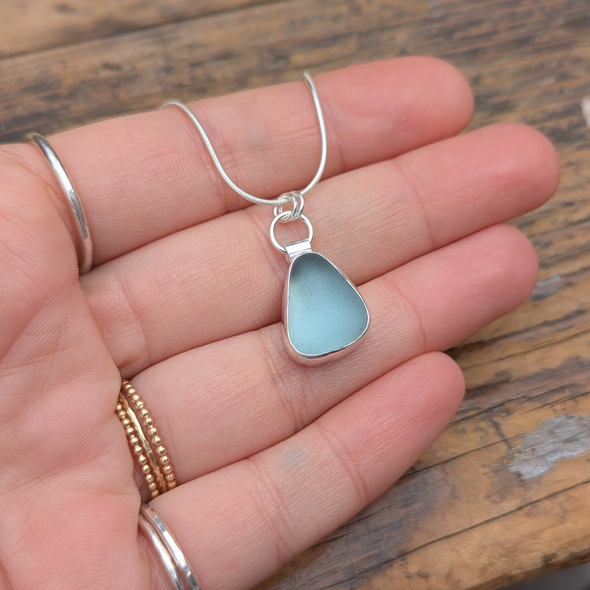 All photos are taken in natural daylight with no filters. Colours may vary slightly depending on your screen, and as with all true sea glass, the gem will appear to shift shades in different lighting, often glowing beautifully in direct light.